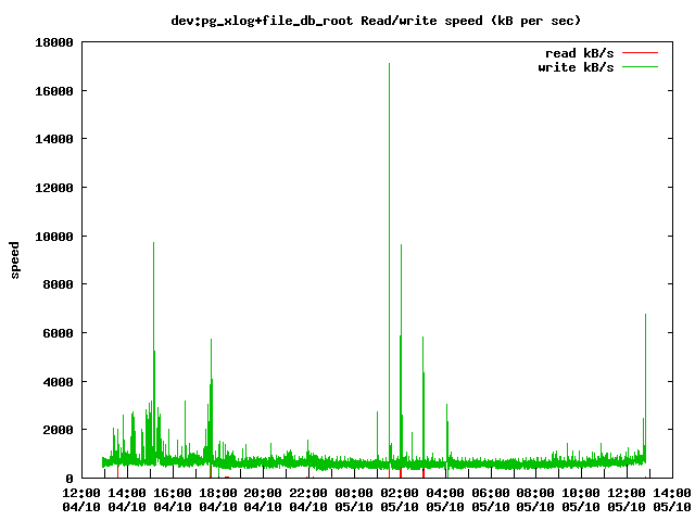 Понятно, что всегда последовательной работы добиться трудно, а часто и невозможно, но сопоставляя эти цифры — можно оценить улучшило или ухудшило изменение логики работы с диском нагрузку на него. Графики Собственно смотреть логи глазками — дело неблагодарное. Посему написал несколько «скриптов» bash и gnuplot чуть чуть парсящее логи и строящее графики. Построение графика для одного устройства по 1-му параметру плюс гладкая безье: #!/bin/bash #echo "usage: $0 <iostat.log> <disk name> <out.png> <title> <yaxis-title> <column1> <title1> echo "procesing $1 for device $2, plotting $3 ($4 - $7)" cat $1 | grep "$2 " > dat.dat gnuplot <<_EOF_ set terminal png set output "$3" set title "$4" set xdata time set timefmt "%Y-%m-%d %H:%M:%S" set format x "%H:%M\n%d/%m" set xtics nomirror scale 3,2 set ylabel "$5" set samples 60 plot "dat.dat" using 1:$6 title "$7" with impulses, \ "dat.dat" using 1:$6 title "$7 avg" smooth bezier lw 2 _EOF_ rm dat.dat И то же самое график для одного устройства по 2-ум параметрам: #!/bin/bash echo "procesing $1 for device $2, plotting $3 ($4 - $7, $9)" cat $1 | grep "$2 " > dat.dat gnuplot <<_EOF_ set terminal png set output "$3" set title "$4" set xdata time set timefmt "%Y-%m-%d %H:%M:%S" set format x "%H:%M\n%d/%m" set xtics nomirror scale 3,2 set ylabel "$5" set samples 10 plot "dat.dat" using 1:$6 title "$7" with lines, \ "dat.dat" using 1:$8 title "$9" with lines _EOF_ rm dat.dat Ну а так как устройств много, да и серверов несколько, а ручками запускать лень, я написал еще парочку примитивных скриптов: plot_info.sh #!/bin/bash echo "usage: $0 <n> <flitle> <title> <y-axis> <column1> <column-title> <column2> <column-title>" echo "$0 2 rw 'Read/write iops per second' 'iops' 4 'read request/s' 5 'write request/s'" #/dev/cciss/c0d0p1 20G 12G 7.2G 61% / #/dev/cciss/c0d0p6 476G 213G 239G 48% /ARCHIVE #/dev/cciss/c0d0p5 9.7G 264M 8.9G 3% /var #/dev/cciss/c0d0p3 9.7G 167M 9.0G 2% /TMP #/dev/cciss/c0d1p1 559G 39G 521G 7% /SQL #/dev/cciss/c0d2p2 1020G 320G 701G 32% /SQL/file #/dev/cciss/c0d2p1 98G 1.9G 96G 2% /SQL/pgsql/data/pg_xlog ./graph$1.sh ./log201.txt c0d0p2 201/c0d0p2.swap.$2.png "swap $3" "$4" "$5" "$6" "$7" "$8" ./graph$1.sh ./log201.txt c0d0p3 201/c0d0p3.tmp.$2.png "/TMP $3" "$4" "$5" "$6" "$7" "$8" ./graph$1.sh ./log201.txt c0d1p1 201/c0d1p1.sql.$2.png "/SQL $3" "$4" "$5" "$6" "$7" "$8" ./graph$1.sh ./log201.txt c0d2p1 201/c0d2p1.pg_xlog.$2.png "pg_xlog $3" "$4" "$5" "$6" "$7" "$8" ./graph$1.sh ./log201.txt c0d1 201/dev.c0d1-sql.$2.png "dev:/SQL $3" "$4" "$5" "$6" "$7" "$8" ./graph$1.sh ./log201.txt c0d2 201/dev.c0d2-xlog_file.$2.png "dev:pg_xlog+file $3" "$4" "$5" "$6" "$7" "$8" и task.sh #!/bin/bash ./plot_info.sh 3 iops_load 'Estimated IOPS' 'iops_limit' '(100*($7+$6)/$14)' 'iops' ./plot_info.sh 0 wrratio 'Write percent' 'wratio' '($9*100/($10+$9))' '%' ./plot_info.sh 0 qwaitratio 'Queue wait ratio' 'qwaitratio' '($13*100/$12)' '%' ./plot_info.sh 2 rwqm 'Request merged and queued to device' 'rqm/s' 4 'read rqm/s' 5 'write rqm/s' ./plot_info.sh 2 request 'Request issued to device' 'requests' 6 'r/s' 7 'w/s' ./plot_info.sh 2 rwspeed 'Read/write speed (kB per sec)' 'speed' 8 'read kB/s' 9 'write kB/s' ./plot_info.sh 1 rsize 'Average request size' 'avgrq-sz' '($10*4)' 'kB' ./plot_info.sh 1 qsize 'Average query size' 'avgqu-sz' 11 'queries' ./plot_info.sh 2 await 'Average request servicing time' 'await' "'12'" 'waiting msec' 13 'servicing msec' ./plot_info.sh 1 util 'Bandwidth utilization' '%util' 14 '%' ./plot_info.sh 1 iops 'Average IOPS' 'iops' "'7+6'" 'iops' За код прошу не пинать писалось для работы быстро и на коленке( для чего собственно скрипты умными людьми и придумывались). В итоге получаем симпатичные графики: Резюмируя В качестве резюме пара «успешных историй» Обычно у пользователя симптом только один: все тормозит. Ниже буду приводить примеры как анализ логов iostat помог выявить проблему, или указать что проблема, не в диске. История первая В iostat увидели аномально высокие значения rKB/s при выполнении самых простейших запросов, включая запросы с LIMIT 1 (десятки и сотни мегабайт) — явно читаем больше чем надо. Из этого смогли в итоге показать, что не отрабатывал автовакуум (хоть и запускался). Дальнейший лог вакуума показал, что max_fsm_page на два порядка ниже необходимого. История вторая Длительный коммит транзакции порядка 60 секунд содержащей всего с десяток DDL запросов. Все грешили на высокую «фоновую» нагрузку, типа от этого и тормозит. Но iostat всячески показывал, что в это время никакой дополнительно аномальной нагрузки на диск нет. В итоге дело в «небольшом» косяке СУБД PostgreSQL 8.3 связанное с большим чис