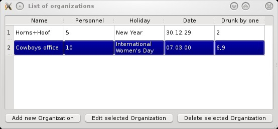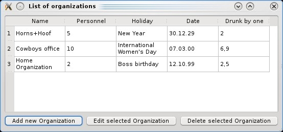 void OrganizationsList::addOrganization(Organization& newOrganization) { Похожим образом организован метод delOrganization(), удаляющий элемент из модели и списка. Исключаемая организация определяется номером строки, в которой она хранится и отображается, этот номер мы получаем из индекса соответствующего элемента модели: void OrganizationsList::delOrganization(const QModelIndex & index) { Главное окно приложения В главном окне приложения мы разместим таблицу view, отображающую список организаций (в начале работы программы он будет пустым) и три кнопки класса QPushButton, чтобы пользователь мог добавить организацию, редактировать или удалять выбранный элемент. Кроме виджетов, необходимо создать модель данных dataList класса OrganizationsList и слоты для обработки сигналов нажатия кнопок: #include <QMainWindow> class MainWindow : public QMainWindow { В конструкторе выделим память для модели данных и таблицы, которая будет их отображать, зададим соответствие между моделью и отображением вызовом метода setModel() класса QTableView, создадим кнопки и разместим виджеты на главном окне, а также соединим сигналы кнопок с соответствующими слотами: MainWindow::MainWindow() : QMainWindow () { Для добавления организации создадим диалоговое окно dialog класса OrganizationEditDialog (этот класс и работа с ним были подробно описаны в предыдущих статьях ): void MainWindow::addButtonClicked() { При редактировании данных необходимо убедиться, что они существуют, это можно сделать, проверив индекс текущего выбранного элемента таблицы. Для редактирования также как в предыдущем методе будет вызвано диалоговое окно: void MainWindow::editButtonClicked() { Для удаления элемента необходимо вызвать метод delOrganization() разработанного нами класса модели OrganizationsList, предварительно проверив, что в таблице выбран элемент: void MainWindow::delButtonClicked() { Главная функция приложения: #include <QtGui/QApplication> QApplication app(argc, argv); В заключение приведем картинку с внешним видом приложения: И во время редактирования данных: |