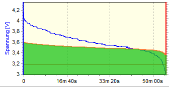 Это график разряда литиевого аккумулятора, на котором видно, что напряжение снижается к концу разряда. А это означает, что простое умножение А·ч на В (которое сработало бы в случае с блоком питания, выдающим стабильное напряжение), дает значение энергии с очень большой погрешностью. Для того, чтоб узнать, сколько ватт-часов в аккумуляторе, можно, например, построить график мощности (которую можно получить умножением мгновенных значений тока и напряжения) а потом найти площадь под кривой этого графика: