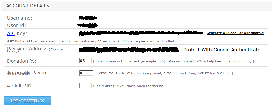 И только немногие похожи на что-то вменяемое. Я выбирал пулы с системой выплаты PPLNS и остановился на wemineltc.com. Примечание: на 10.05.2017 данный пул исчез вместе со всеми невыведенными лайткоинами. Так пулы зарабатывают на майнерах. Институт репутации тут не помогает: пул существовал несколько лет, и просто резко закрылся. Что такое PPLNS можно попытаться понять из следующего описания: Система выплат PPLNS (Pay Per Last N Shares) Оплата за последние N шар. Отличие от PPS в том что нет фиксированной оплаты за шару, и в данном случае играет роль скорость нахождения блока или время раунда, чем быстрее находятся блоки тем больше мы получим, ну и наоборот. Это значит что больше не засчитываются действительные шары одного раунда, но рассматриваются подряд N шар, вне зависимости от того к каком раунде они были. Это значит что на более коротких раундах мы, как бы накапливаем шары на следующий раунд, и чем больше подряд коротких раундов – тем больше накоплений, в свою очередь длинный раунд может истощить наши запасы накопленных шар. Что же такое число N? – это приблизительное значение количества шар в раунде, которое берется для расчета награды и оно зависит от сложности. PPLNS используется во всех p2pool. + Наиболее выгодная система для постоянных майнеров, т.к. предусматривает двойную и тройную оплату шар. Регистрируемся на сайте wemineltc.com. Вводим логин, пароль, емайл, PIN-код, ответ на контрольный вопрос. Странно, но подтверждающего письма на указанный e-mail не приходит, можно работать сразу. Логинимся, и переходим в раздел "My Account" - "Account details". Видим свои начальные данные: Необходимо задать Payment Address - то есть Лайткоин-адрес, куда будут направляться для выплаты для вас. Рядом с ним написано "Change below". То есть, этот адрес меняется ниже. Вот как выглядит расположенный ниже раздел смены адреса выплат: Нужно ввести адрес своего кошелька, ввести PIN-код (который задавали при регистрации), и нажать кнопку "Send e-mail code". На e-mail придет код, который нужно ввести в этом же разделе (после нажатия "Send e-mail code" появится еще одна строка для ввода отправленного кода). После этих действий в разделе Account details появится Лайтоин-адрес. Далее нужно установить параметр "Automatic Payout" в значение, отличное от нуля. Параметр "Donation %" (вознаграждение для организаторов пула) можно уменьшить до 0.5, если считаете нужным. Чтобы изменения применились, перед нажатием "Update settings" надо ввести PIN-код. Далее переходим на страницу Worker Accounts, и указываем там параметры нашего веркера. Нужно задать пароль, а так же изменить другие параметры, если необходимо. Парамеры следующие: