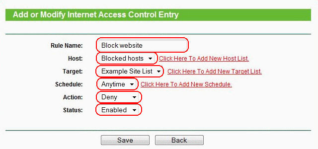 Как настроить блокирование веб-сайтов в контроле доступа? На беспроводных маршрутизаторах TP - LINK можно настроить блокировку сайтов, для этого необходимо выполнить следующие шаги (возьмем в качестве примера TL - WR 1043 ND). Шаг 1: Вход в панель управления маршрутизатора Откройте веб-браузер и введите в адресную строку LAN IP -адрес вашего маршрутизатора ( IP -адрес маршрутизаторов TP - LINK по умолчанию - 192.168.1.1), затем нажмите Enter . Когда вам будет предложено, введите имя пользователя и пароль маршрутизатора TL - WR 1043 ND (имя пользователя и пароль по умолчанию - admin ) Шаг 2: Создание перечня компьютеров, для которых настраивается блокировка доступа к сайтам Зайдите Access Control (Контроль доступа)-> Host (Узел), затем нажмите " Add New ..." ( Создать …) Выберите " IP Address ", затем укажите краткое описание правила, которое вы хотите задать в поле "Host Description :" (Описание узла). Введите диапазон IP -адресов вашей сети, для которых вы хотите заблокировать доступ на нежелательные сайты (например, если указать 192.168.1.100 - 192.168.1.199, то будет происходить блокировка для всех компьютеров, которым автоматически маршрутизатор TL - WR 1043 ND назначает IP -адрес). На примере ниже показано создание списка компьютеров с IP 192.168.1.100 - 192.168.1.199. Наименование списка задано как "Blocked hosts": Нажмите " Save " (Сохранить) – новый перечень узлов появится на странице "Host Settings " (Настройки узла): Шаг 3: Создание перечня нежелательных сайтов Зайдите в меню Access Control (Контроль доступа) -> Target (Цель), затем нажмите " Add New ..." ( Создать ) Выберите "Domain Name" (Доменное имя) в поле "Mode" (Режим), затем укажите краткое описание создаваемого перечня. В поле (в 4-х полях) "Domain Name :" (Доменное имя) введите ключевые слова сайтов, которые вы хотите, чтобы маршрутизатор блокировал (не обязательно полные названия сайтов, таких как www.google.com – можно просто указать google – и вы создадите правило, согласно которому будет производиться блокировка всех сайтов, которые в своем адресе содержат слово "google ") Нажмите " Save " (Сохранить) – новый список нежелательных сайтов отобразиться на странице "Target Settings" (Настройки цели). Шаг 4: Создание правил блокировки нежелательных сайтов Зайдите в Access Control (Контроль доступа) -> Rule (Правило) и отметьте "Enable Internet Access Control" (Включить контроль доступа в Интернет), затем выберите опцию " Allow the packets not specified by any access control policy to pass through the Router" (Позволить пакетам не указанным политикой контроля доступа проходить через маршрутизатор) (если будет установлена опция " Deny " (Запретить), все веб-сайты, кроме тех, для которых вы задали правила узла/цели будут заблокированы), затем нажмите " Save " (Сохранить). В разделе меню Access Control (Контроль доступа) -> Rule (Правило) нажмите " Add New ..." (Создать), затем введите краткое описание правила:
