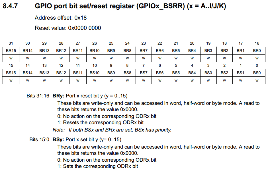 Мы не будем менять данных параметров, поскольку нас вполне устраивают значения по умолчанию. Установка значения на пине МК Наконец-то мы подошли к моменту управления состоянием выхода МК. Для установки выходного значения на определенном пине МК есть два метода. Используем регистр GPIO port bit set/reset register (GPIOx_BSRR) Запись «0» или «1» в биты 0-16 приводят к соответствующему изменению состояния пинов порта. Для того, чтобы установить определенное значение на выходе одного или нескольких пинов МК и не изменить состояния остальных, необходимо будет пользоваться операцией модификации отдельных бит. Такая операция выполняется не менее чем за 3 такта. Если же необходимо в часть битов записать 1, а в другие 0, то понадобится не менее 4 тактов. Данный метод предпочтительнее всего использовать для изменения состояния выхода на противоположное, если его изначальное состояние не известно. GPIO port bit set/reset register (GPIOx_BSRR) В отличии от предыдущего метода, запись 0 в любой из битов данного регистра не приведет ни к чему (да и вообще, все биты write-only!). Запись 1 в биты 0-15 приведет к установке «1» на соответствующем выходе МК. Запись 1 в биты 16-31 приведет к установке «0» на соответствующем выходе МК. Этот метод предпочтительнее предыдущего, если необходимо установить определенное значение на пине «МК», а не изменить его. Зажигаем светодиод! Найдя адреса всех необходимых регистров, можно написать программу, которая включает светодиод: void main() { //Enable port D clocking *(unsigned long*)(0x40023830) |= 0x8;