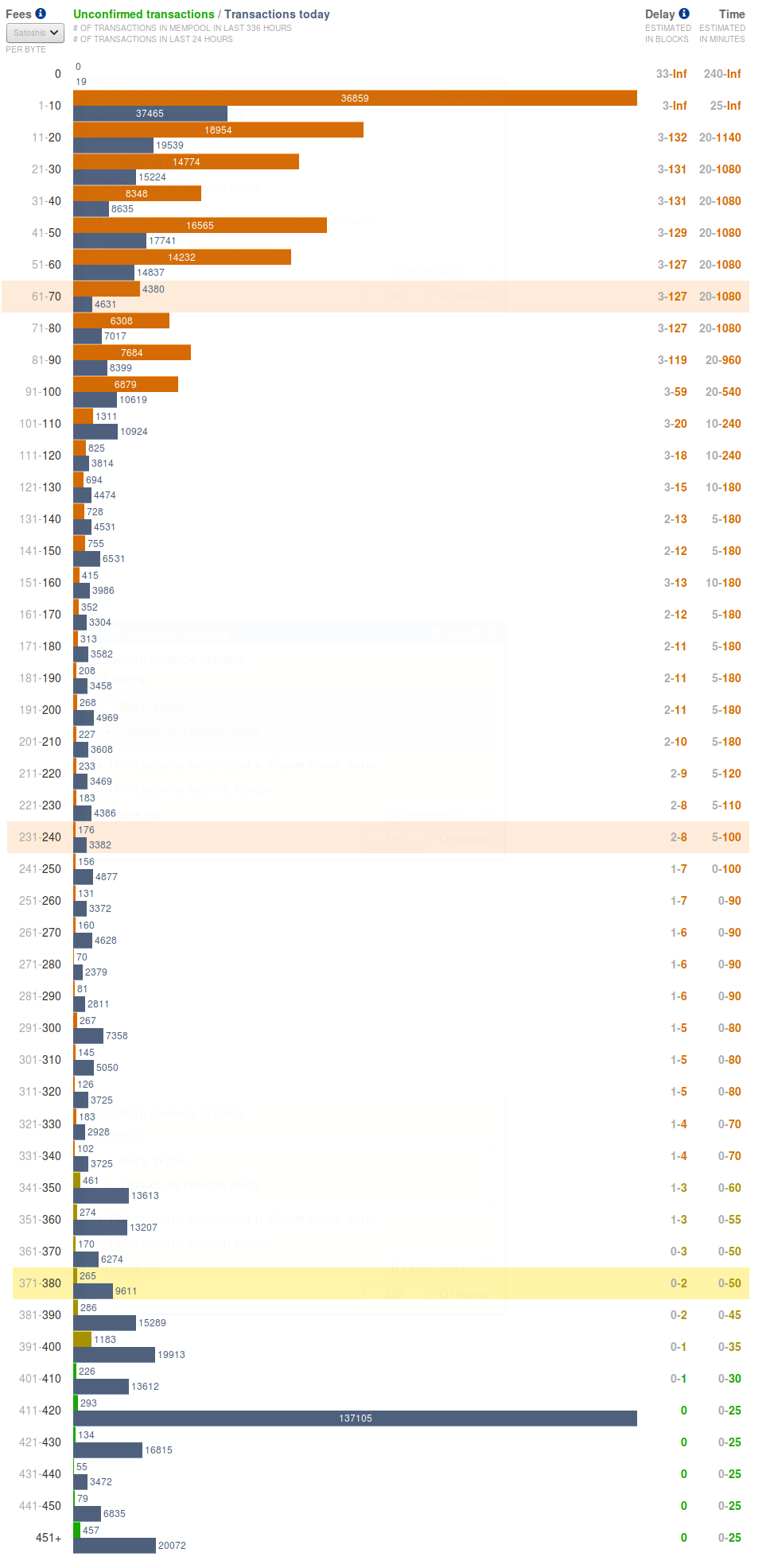 Не секрет, что в 2017 году стоимость транзакций стала такой, что нужно трижды подумать перед тем, как переводить небольшие суммы в размере двух-трех тысяч рублей. Поэтому тем, кто редко пользуется биткоином, но кому нужно быстро сделать платеж, необходимо адекватно оценивать размер комиссии за транзакцию перед совершением самой транзакции. Сделать это достаточно сложно в условиях, когда ситуация меняется ежедневно. Но способы оценки есть. Способ первый - вручную через сайт BitAps.com Нужно открыть ссылку: https://bitaps.com/ru/ после чего в открышейся странице найти строку "Рекомендуемая комиссия": Далее нужно учесть размер транзакции в байтах, так как стоимость указывается за байт. Средний размер обычной транзакции, у которой 2 входа и 2 выхода составляет ~380 байт. Таким образом, стоимость самой медленно подтверждающейся транзакции (за 320 satochi/byte) вычисляется по формуле: 320 / 100 000 000 * 380 = 0,001216 Bitcoin На 24.08.2017, при курсе 4169 USD/Bitcoin, это 5,06$. А в рублях это ~300 руб. Таким образом, при переводе 1000 руб, теряется 30%. Вывод: биткоин не предназначен для перевода маленьких сумм! Для того, чтобы платить за перевод 1%, нужно переводить не менее 30 000 руб (около 500$). Способ второй - автоматический расчет через сайт EstimateFee.com Нужно открыть ссылку: https://estimatefee.com, выбрать время подтверждения блока (чем больше время, тем меньше комиссия) в строке "to confirm within": Сразу будет высчитана стоимость транзакции в долларах. Ее можно сравнить тем, что вычислялось вручную, и понять порядок стоимости транзакции. Способ третий, самый выгодный Существует сайт https://bitcoinfees.earn.com/ на котором отображается самая свежая статистика по прошедшим и отклоненным транзакциям. Оранжевая линия - не завершенные транзакции, синяя линия - завершенные. Слева цена отчисления в Sat/Byte (напоминаю, что 1 Сатоши это 0.00000001 BTC). Выглядит эта таблица так: Задача в том, чтобы указать отчисление за транзакцию не меньше, чем та цена, у которой синяя линия длиннее чем оранжевая. В данном случае это 101-110. Меньше этой суммы указывать не следует, ибо транзакция будет отклоняться почти всеми майнерами. Лучше взять значение из среднего диапазона, ориентируясь на количество блоков (число справа), спустя которые транзакция, предположительно, попадет в блокчейн. |