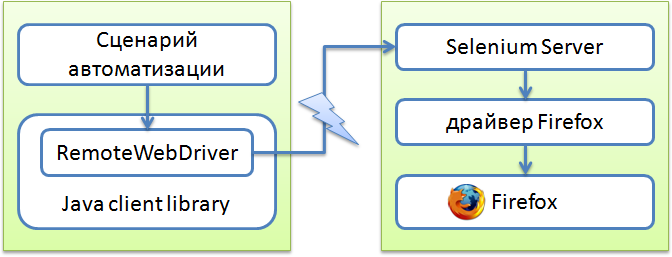 Selenium Server – это сервер, который позволяет управлять браузером с удалённой машины, по сети. Сначала на той машине, где должен работать браузер, устанавливается и запускается сервер. Затем на другой машине (технически можно и на той же самой, конечно) запускается программа, которая, используя специальный драйвер RemoteWebDriver, соединяется с сервером и отправляет ему команды. Он в свою очередь запускает браузер и выполняет в нём эти команды, используя драйвер, соответствующий этому браузеру: