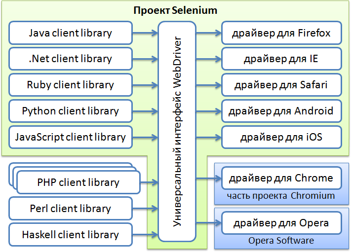 Аналогичная ситуация и с клиентскими библиотеками – в рамках проекта Selenium разрабатываются библиотеки для языков Java, .Net (C#), Python, Ruby, JavaScript. Все остальные реализации не имеют отношения к проекту Selenium, хотя, возможно, в будущем, какие-то из них могут влиться в этот проект.