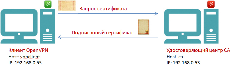 Рис. 2. Получение сертификата для сервера OpenVPN Сервер OpenVPN создает свой приватный ключ и файл запроса на получение сертификата. Файл запроса передается в удостоверяющий центр, например, на USB флеш-диске. Удостоверяющий центр на основе запроса создает подписанный сертификат, который затем требуется перенести на сервер OpenVPN, также на USB флэш-диске. Если к безопасности не предъявляется особых требований или вы только изучаете OpenVPN, можно подключить машину удостоверяющего центра к сети и передавать запросы и сертификаты, например, с помощью утилит SFTP или SCP. Можно даже совместить функции CA и, например, сервера OpenVPN в одном хосте. Аналогичным образом необходимо получить сертификаты для всех клиентских узлов (рис. 3).