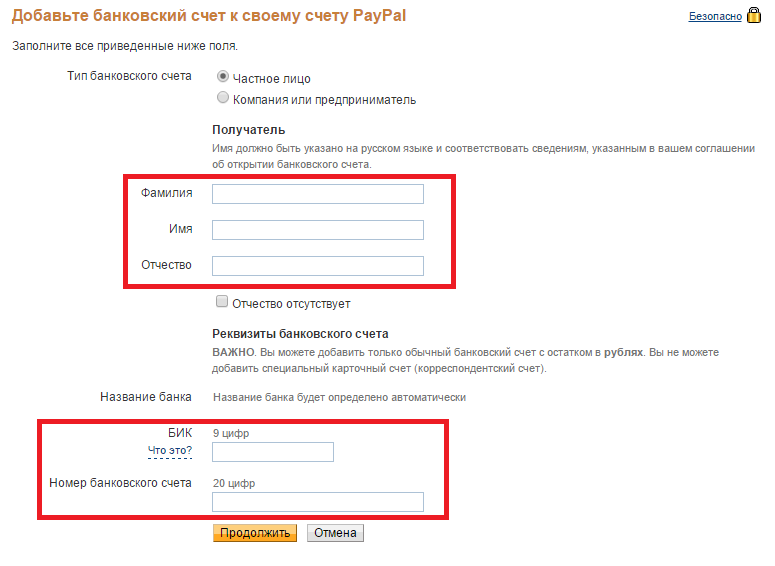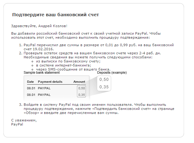 Если вы часто получаете платежи на счет платежной системы PayPal, то достаточно быстро возникнет вопрос – как вывести деньги из PayPal? На мой взгляд, удобнее всего выводить средства на банковскую карту. Привязываем данные карты в PayPal Заходим в свой личный кабинет на сайте PayPal и открываем вкладку Счет: Затем выбираем «Добавить банковский счет» (пункт «Добавить карту» предназначен для пополнения счета PayPal, а не для вывода денег. Поэтому его не трогаем). В открывшимся окне выбираем «Частное лицо» и заполняем строки с вашими ФИО: Далее нам нужно будет указать БИК и номер банковского счета. Важный момент: используется именно банковский (20-тизначный) счет вашей карты, а не те 16 цифр, которые нарисованы на лицевой стороне вашей карты. Узнать БИК и номер счета вашей карты можно через сервис Сбербанк Онлайн или получив выписку в любом банкомате Сбербанка. Узнаем платежные данные карты Сбербанка В Сбербанк Онлайн данный карты можно получить так – выбираем нужную нам карту, жмём по вкладке «Информация по карте» , а затем «Реквизиты перевода на счет карты» : Здесь как раз и находятся нужные нам данные: Важно: не спутайте «Номер счета» и «Корреспондентский счет». Нам нужен именно «Номер счета». Далее копируем БИК и Номер счета в форму PayPal и подтверждаем правильность введенной информации. Теперь осталось только подтвердить банковский счет. Подтверждаем банковский счет После ввода всей необходимой информации PayPal присылает вот такое письмо: В течение нескольких дней PayPal отправит на вашу карту 2 перевода суммой от 0.01 до 0.99 руб.: Как только эти переводы получены, заходим в PayPal на вкладку «Мои счета» и подтверждаем факт получения этих переводов – вводим их суммы: Готово! Теперь можно вывести деньги из PayPal на карту. Для проверки попробуем вывести 200 рублей из PayPal на банковскую карту: Вывести деньги из PayPal – легко! Сделать это можно либо с главной страницы сервиса, либо из вкладки «Счет», нажав «Вывести средства». Получив деньги на карту, снять их можно через любой банкомат Сбербанка или воспользоваться ими через Сбербанк Онлайн. Также немного информации: