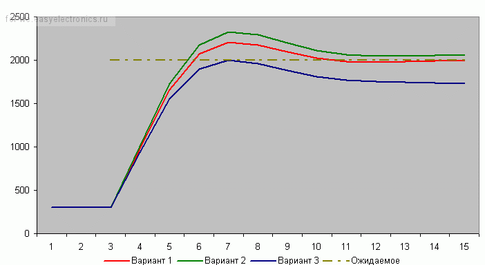 Все, расслабились – больше эта формула нам в работе не понадобится, она для пояснения сути. А суть тут такая. У нас есть воздействие, наша Функция (u (t) ). Она состоит из трех составляющих – Пропорциональной, Интегральной и Дифференциальной (отсюда и ПИД-регулятор). Формула в вышеприведенном виде хороша для изучения, но неудобна для расчетов (хотя бы потому, что в вычислительной технике надо переходить к численным методам). В программной реализации, если верить этой статье , переходят к дискретной реализации: u(t) = P (t) + I (t) + D (t); P (t) = Kp * e (t); I (t) = I (t — 1) + Ki * e (t); D (t) = Kd * {e (t) — e (t — 1)}; Вот это уже выглядит куда реальнее и понятнее! Мы вычисляем сумму трех составляющих. Каждая из них определяется своими коэффициентами. Если данный коэффициент нулевой, то составляющая в вычислении не участвует. С этой формулой мы и будем работать далее, ее я и реализую. Впрочем, есть еще и другая, рекуррентная реализация: u(t) = u(t — 1) + P (t) + I (t) + D (t); P (t) = Kp * {e (t) — e (t — 1)}; I (t) = I * e (t); D (t) = Kd * {e (t) — 2 * e (t — 1) + e (t — 2)}; Какая из них лучше/правильней? Математика, в общем-то, одинаковая. Коэффициенты тоже. Говорят, что есть разные подводные булыжники при реализации. Обратите внимание! Коэффициенты тут – обязательно дробные числа! В языке программирования Си – как минимум float, а лучше бы и double. Вся магия ПИД-регуляторов – именно в этих коэффициентах. Как их подбирать – посмотрим в конце. А сейчас переведем дух от математики и поедем к изучению поведения этой формулы. Все расчеты и моделирование я проводил на модели в Excel. Он – файл – приложен внизу, с ним можно поиграться самостоятельно. Модель – сугубо для ознакомления с идеей! Т. е. не надо ее стараться привести к какому-то реальному процессу, искать в ней научный смысл и т. п. Там все цифры слегка «отфонарные». Но зато и файл простенький и несложный. И моделируется быстро. И дает возможность понять суть ПИД-регулятора. Пару слов по файлу я дам в конце. Пропорциональная составляющая Первый коэффициент – пропорциональный. Он самый очевидный и понятный (реально я когда-то давно сам вывел формулу ПИД-регулятора, кому-то показал, и он рассказал мне об этой теории; так вот, вывод я начал с пропорционального вида). Рассмотрим его – пропорционального коэффициента — влияние на результат. «Ожидаемое» – это то, что мы хотим получить. Вначале оно равно какому-то низкому значению (в нашем примере – это те обороты двигателя, которые создает стартер). Далее, в момент времени 3, оно вдруг стало равно 2000 (завели мотор и, исходя из текущей температуры, мы должны получить 2000 оборотов в минуту). (Небольшая ремарка – в автомобилях частоту измеряют в кол-во оборотов в минуту!) Сделаем первый вариант: Kp = 2. Посмотрим на красную линию. Что мы видим? По ходу дела обороты начали расти – ошибка стала снижаться – значение коррекции постепенно растет — красная линия растет (обороты двигателя увеличиваются). В какой-то момент (почему-то 13-ый) обороты достигают требуемой величины. Класс? Супер! Да вот только медленно как-то… Попробуем другой коэффициент: Kp = 5. Что видим? Зеленая линия. Достигла результата шустро – на 6-ом шаге. Класс! Да вот – ой! – перелет (по науке перерегулирование). Потом, правда, вернулись назад – порядок. А что если коэффициент сделать еще больше? Kp = 20. Синяя линия – бух! За один шаг! Но – сразу перелет. Потом падаем вниз – ошибка стала отрицательной. 