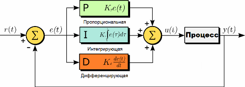 ПИД (от англ. P-proportional, I-integral, D-derivative) — регулятором называется устройство, применяемое в контурах управления, оснащенных звеном обратной связи. Данные регуляторы используют для формирования сигнала управления в автоматических системах, где необходимо достичь высоких требований к качеству и точности переходных процессов. Управляющий сигнал ПИД-регулятора получается в результате сложения трех составляющих: первая пропорциональна величине сигнала рассогласования, вторая — интегралу сигнала рассогласования, третья — его производной. Если какой-то из этих трех компонентов не включен в процесс сложения, то регулятор будет уже не ПИД, а просто пропорциональным, пропорционально-дифференцирующим или пропорционально-интегрирующим. Первый компонент — пропорциональный Выходной сигнал дает пропорциональная составляющая. Сигнал этот приводит к противодействию текущему отклонению входной величины, подлежащей регулированию, от установленного значения. Чем больше отклонение — тем больше и сигнал. Когда на входе значение регулируемой величины равно заданному, то выходной сигнал становится равным нулю. Если оставить только эту пропорциональную составляющую, и использовать только ее, то значение величины, подлежащей регулированию, не стабилизируется на правильном значении никогда. Всегда есть статическая ошибка, равная такому значению отклонения регулируемой величины, что выходной сигнал стабилизируется на этом значении. К примеру, терморегулятор управляет мощностью нагревательного прибора. Выходной сигнал уменьшается по мере приближения требуемой температуры объекта, и сигнал управления стабилизирует мощность на уровне тепловых потерь. В итоге заданного значения температура так и не достигнет, ибо нагревательный прибор в просто должен будет быть выключен, и начнет остывать (мощность равна нулю). Больше коэффициент усиления между входом и выходом — меньше статическая ошибка, но если коэффициент усиления (по сути — коэффициент пропорциональности) будет слишком большим, то при условии наличия задержек в системе (а они зачастую неизбежны), в ней вскоре начнутся автоколебания, а если увеличить коэффициент еще больше — система попросту утратит устойчивость. Или пример позиционирования двигателя с редуктором. При малом коэффициенте нужное положение рабочего органа достигается слишком медленно. Увеличить коэффициент — реакция получится более быстрая. Но если увеличивать коэффициент дальше, то двигатель «перелетит» правильную позицию, и система не перейдет быстро к требуемому положению, как хотелось бы ожидать. Если теперь увеличивать коэффициент пропорциональности дальше, то начнутся осцилляции около нужной точки — результат снова не будет достигнут... Второй компонент - интегрирующий Интеграл по времени от величины рассогласования — есть основная часть интегрирующей составляющей. Она пропорциональна этому интегралу. Интегрирующий компонент используется как раз для исключения статической ошибки, поскольку регулятор со временем учитывает статическую погрешность. В отсутствие внешних возмущений, через какое-то время подлежащая регулированию величина будет стабилизирована на правильном значении, когда пропорциональная составляющая окажется равной нулю, и точность выхода будет целиком обеспечена инте