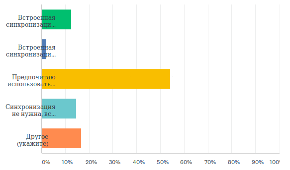 Все-таки в опросе принало участие много технарей. Иначе как объяснить, что удобная встроенная синхронизация на сервере разработчика ПО нужна только 12% пользователей? Возможно, что я некорректно сформулировал вопрос, и люди не поняли что имеется в виду. С другой стороны, более половины готовы настраивать синхронизацию сами, что весьма удивительно.