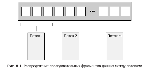 При распределении данных простейшим считается вариант, когда первые N элементов назначаются одному потоку, следующие N элементов — другому и т. д. (рис. 8.1), но можно использовать и другие схемы. Независимо от способа распределения данных, каждый поток обрабатывает только назначенные ему элементы, никак не взаимодействуя с другими потоками до тех пор, пока не завершит обработку.