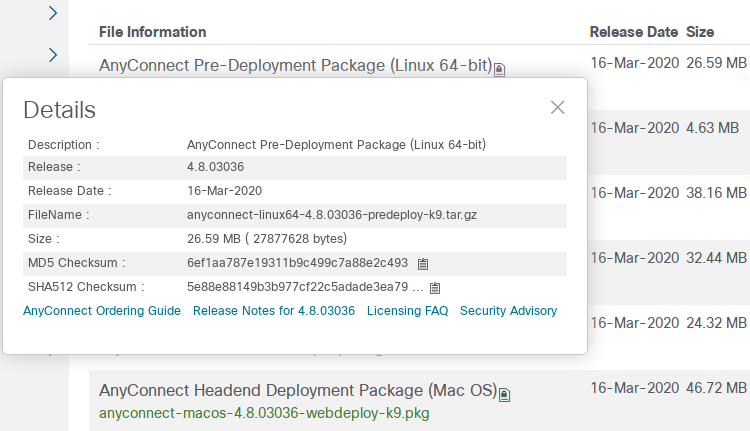 Получение Cisco AnyConnect Компания Cisco - очень странная компания, традиционно вставляющая палки в колеса своим собстевенным клиентам. Казалось бы, компания производит аппаратное обрудование, поэтому программное обеспечение завязано именно на аппаратуру Cisco. Если нет аппаратуры Cisco, то воспользоваться ПО Cisco не получится, оно даром никому не нужно. Но нет: в компании Cisco решили, что даже клиентское программное обеспечение должно выдаваться только по заранее купленным подпискам, и закрыто для скачивания логином-паролем. Но и это еще не все: даже имея логин и пароль для личного кабинета на сайте Cisco, и имея оплаченную подписку, совершенно не факт, что клиентское ПО будет доступно. Какие там хитросплетения корпоративного маразма работают - мало кому ведомо. Поэтому есть два пути: либо потратить пару суток на пинания админов и бодания с техподдержкой и таки получить файлы клиента, либо решать свои проблемы самому и быстро. Если вы думаете, что вы один такой, то нет: клиенты Cisco постоянно попадают в ситуацию, когда нужно получить доступ к серверу предприятия, а админы не подготовились заранее. Или подготовились, но так как админы оказались вендо-админами, то и доступ в сеть умеют делать только через Windows, ведь "других операционных систем на свете не бывает". Лучшее что вам предложат - это пойти и за свои деньги приобрести лицензию на Windows и установить ее, или предложат поставить пиратскую версию Windows: все равно никто не узнает. Не хотите так? Тогда проблему с подключением вам придется решать самостоятельно. Итак, что можно сделать? Если покопаться, то в разных закоулках интернета можно найти выложенные клиенты Cisco различных версий. Они лежат на торрентах, или частенько выложены разными компаниями в публичных каталогах веб-серверов, и по каким-либо причинам проиндексированы поисковиками. Например, на момент написания этой статьи, клиенты нашлись на сайтах различных сетевых интеграторов, и даже на сервере самого крупного российского интернет-магазина: видимо, они лежат там для возможности установки удаленного соединения между сотрудниками и серверами предприятия. Файл с клиентом для Linux называется примерно так: anyconnect-linux64-4.6.03049-predeploy-k9.tar.gz (Я намеренно не даю прямые ссылки на скачивание файлов, чтобы у тех, кто выложил файлы клиентов, не возникло лишних проблем. Просто пользуйтесь поисковиками, и все найдете). Понятно, что доверять таким источникам программного обеспечения нельзя. Мало ли какие злоумышленники выложат модифицированно ПО Cisco, которое будет сливать на сторону логины-пароли и ключи доступа к сети предприятия. Поэтому поступить можно следующим образом. На официальном сайте Cisco можно просматривать информацию о пакетах клиентского ПО без ввода логина-пароля. Вот, например, ссылка на просмотр ПО AnyConnect: https://software.cisco.com/download/home/286281283/type/282364313/release/4.8.03036 Сам пакет вам не дадут скачать, но посмотреть о нем инфу можно. В информации будет, в том числе и контрольные суммы по стандартам MD5 и SHA512: Таким образом, взяв инсталляционный пакет из стороннего источника, всегда можно проверить, является ли он доверенным пакетом. Установка AnyConnect на Linux Распаковав *.tar.gz с VPN-клиентом, нужно просто, от рута, запустить скрипт: vpn_install.sh Далее нужно согласиться с лицензионным соглашением, и клиент будет установлен. Его можно будет найти в основном меню окружения рабочег