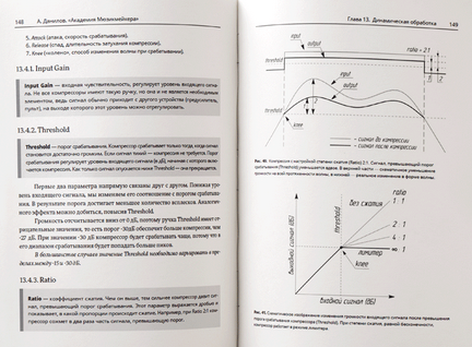 Эту книгу рекомендуется иметь на столе каждому звукорежиссеру или музыканту, самостоятельно записывающему свою музыку. Очень подробная книга. Затронуты практически все темы теории музыки и гармонии, а так же много информации по цифровой аудиозаписи и использованию звукообрабатывающих устройств. Кладезь знаний, а не книга. Автор самостоятельно распространяет издание, стоит 900 руб (на 2021 г.) купить можно на официальном сайте musicmaker.pro (сайт с начала 2024 г. недоступен). Для получения книги можно попробовать написать запрос о покупке на официальный e-mail: danalex@inbox.ru. Объем книги 473 страницы. Книга имеет множество качественных иллюстраций. Иллюстрации сделаны во всех разделах: как в теории музыки, так и в технических главах. * * * Содержание Введение Глава 1. От музыкального образования к продюсированию Глава 2. Вечная проблема железа и софта РАЗДЕЛ 1. СТУДИЙНОЕ ПОМЕЩЕНИЕ И ОБОРУДОВАНИЕ Глава 3. С чего начинается студия Глава 4. Студийное помещение 4.1. Акустическая обработка помещения 4.2. Плавающий пол 4.3. Резонансы и стоячие волны 4.4. Рассеиватели рассеиватель, тип 1, рассеиватель, тип 2 4.5. Акустические низкочастотные ловушки Глава 5. Конфигурация студии звукозаписи 5.1. Аналоговая и цифровая студии 5.2. Нативные и ресурсонезависимые системы 5.3. Работа с MIDI или трекинг аудио, трекинг аудио, работа с MIDI Глава 6. Система записи 6.1. Звуковая карта 6.2. Компьютер 6.3. Конверторы Глава 7. Частота дискретизации и разрядность 7.1. Частота дискретизации, согласование частот дискретизации, цифровые соединения и клок, джиттер 7.2. Разрядность, шумы квантования 7.3. О форматах звука 7.4. Особенности восприятия звука 7.5. Теорема Котельникова и число Найквиста 7.6. Достаточные параметры звука 7.7. Битность системы и битность конвертора 7.8. Дизеринг 7.9. Эстетика звука низкой разрядности Глава 8. Микшерная консоль 8.1. Разъемы, линейный вход, микрофонный вход, директ, инсерт, посылы и возвраты подгруппы, мониторные выходы, мастер-выходы 8.2. Уровни сигнала на линейке, фейдер, чувствительность 8.3. Эквализация на линейке несущая частота и чувствительность, добротность, обрезной фильтр 8.4. Посылы на линейке 8.5. Панорама 8.6. Кнопки на линейке, о фантомном nитaнии 8.7. Мастер-секция, уровень посылов, уровень возвратов, подгруппы, уровни мониторинга и микса 8.8. Индикация Глава 9. Коммутация 9.1. Патчбей 9.2. Кабель-каналы 9.3. Стяжки 9.4. Балансное и небалансное соединение, директ-бокса 9.5. Разъемы небалансные разъемы, балансные разъемы 9.6. Нормализация и параллельные каналы нормализация, параллельные каналы Глава 10. Миди-интерфейс 10.1. Описание миди-интерфейса 10.2. Миди-петля и Local On/Off 10.3. Критерии выбора миди-интерфейса 10.4. Тайминг Глава 11. Синтезаторы 11.1. Для чего нужен синтезатор 11.2. Концертный синтезатор 11.3. Синтезатор для аранжировок 11.4. Вопросы стоимости 11.5. Покупка синтезатора с рук 11.6. Проверка синтезатора дисплей, клавиатура, кнопки, аудиовыходы, MIDI 11.7. Где искать инструменты объявления на форумах, доски объявлений, аукционы 11.8. Оптимальный набор синтезаторов чувствo меры, формирование парка инструментов кpитepии выбора инструментов, организация рабочего процесса Глава 12. Процессоры эффектов 12.1. Разновидности приборов обработки звука 12.2. Приборы пространственной обработки 12.3. Модуляционные процессоры 12.4. Алгоритмы и программы, xopyc, флэнжер, фэйзер, питч-шифтер, ансамбль, гармонайзер 12.5. Можно ли пи