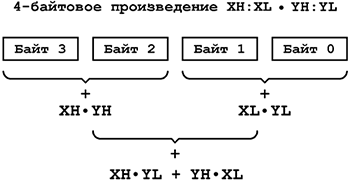 Благодаря тому, что операции сдвига и сложения выполняются за одинаковое время (1 машинный цикл) оба примера равноценны. Иногда встречаются операции умножения на число, которое близко к степени 2. В таких случаях намного проще заменить его суммой двух слагаемых, одно из которых кратно 2n, и использовать только операции сдвига и сложения (вычитания): 63*X = (26-1)*X = 26*X - X = X<<6 – X, 33*X = (25+1)*X = 25*X + X = X<<5 + X, 130*X = (27+2)*X = 27*X + 2*X = X<<7 + X<<2. Для умножения 2-байтовых чисел (обозначим их как XH:XL = 28*XH + XL и YH:YL = 28*YH + YL) применяется следующая вычислительная схема: XH:XL * YH:YL = (28*XH + XL)*(28*YH + YL) = 216*XH*YH + 28*(XH*YL + YH*XL) + XL*YL. Рис.1 Вычислительная схема для умножения двухбайтовых чисел с использованием инструкции умножения Отыскание 32-разрядного результата сводится к последовательности операций однобайтовых умножений и последующего сложения всех произведений с учётом сдвига слагаемых XH*YL, XL*YH на 1 байт и XH*YH на 2 байта, как показано на рис.1. Подпрограмма, реализующая эти действия, приведена ниже. Напомним, что произведение двух однобайтовых множителей, полученное в результате выполнения команды mul Rd,Rr или любой другой команды умножения, всегда заносится в регистровую пару R1:R0.