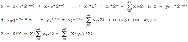 Точно также могут быть разложены числа и с большей разрядностью. Однако с ростом их величины начинают резко возрастать и затраты ресурсов процессора. Так для умножения трёхбайтовых чисел понадобится по 9 операций однобайтовых умножений и двухбайтовых сложений; для четырёхбайтовых уже по 16 операций и т.д. В подобных случаях необходимо использовать другой, наиболее общий алгоритм, который не использует команду mul Rd,Rr. А для микроконтроллеров семейства ATtiny, (а также для устаревшей линейки моделей Classic), у которых отсутствует аппаратный умножитель, он вообще является единственно возможным. Для пояснения алгоритма, перепишем произведение Z двух произвольных двоичных чисел Произведение X*yj называется частичным произведением (X*yj = X при yj =1 и X*yj = 0 при yj =0), а произведение (X*yj)*2j есть не что иное, как частичное произведение, сдвинутое на j разрядов влево. Итак, нахождение произведение X*Y сводится к нахождению суммы частичных произведений X*yj, каждое из которых в свою очередь сдвинуто на j разрядов влево соответственно. На этом принципе основан школьный метод умножения в столбик. Рассмотрим пример умножения двух 4-разрядных чисел: Как видим, для получения результата используются только операции сложения и сдвига. При этом в тех разрядах Y, где yj=0 и X*yj=0. И если предварительно анализировать значения yj/, то можно пропускать пустое сложение с 0 в соответствующих итерациях. Ниже приведена подпрограмма умножения двух трёхбайтовых чисел. В ней для получения суммы частичных произведений, сдвинутых каждое на j разрядов влево, производится сдвиг накопителя произведений m=24 раза вправо, а для экономии памяти младшие 3 байта произведения заносятся в те же регистры, где находился множитель.