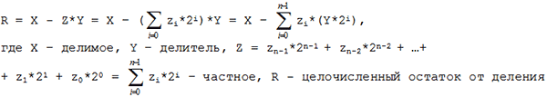 Для чисел большей разрядности необходимо использовать способ деления, основанный на приведенной ниже вычислительной схеме. Для этого представим необходимо выражение операции деления в следующем виде: Нахождение частного сводится к отысканию его коэффициентов zi, которые определяются, согласно формуле, следующим образом: необходимо последовательно сравнивать X с произведениями Y*2i и если X > Y*2i, то в этом случае необходимо произвести вычитание Y*2i из X, а соответствующий разряд zi установить в 1; если X < Y*2i – вычитание пропускается и в этой итерации zi=0. Эта процедура продолжается до тех пор, пока не останется остаток Ri получаются простым сдвигом Y на i разрядов влево. Аналогично производится деление в любой позиционной системе (метод деления в столбик), но проще всего в двоичной из-за того, что в X может содержаться Y*2i максимум один раз (на что и указывает единица в соответствующем разряде). Рассмотрим пример деления: Необходимо обратить внимание на то, что число итераций сравнения должно совпадать с числом значащих разрядов частного (в данном случае n=4 для определения z0…z3). Однако разрядность частного заранее никогда не известна и поэтому всегда необходимо знать максимально возможную разрядность результата деления. На практике чаще всего используют вычисления, в которых частное заведомо умещается в 8,16,24 бита (кратно одному байту) и т.д. При этом нужно использовать 8,16,24 итераций сравнения X с Y*2i, соответственно. С целочисленным остатком R проблем не возникает – его размер ограничен разрядностью Y (R < Y). Подпрограмма деления двухбайтового числа на однобайтовое приведена ниже. В ней для сравнения X с Y*2i (i ∈ {0,…,15}) вместо сдвига делителя Y на n разрядов вправо используется поочерёдный сдвиг делимого на n разрядов влево, а для экономии памяти частное записывается на тоже место, что и делимое. В начале программы осуществляется проверка условия Y ≠ 0, без которого деление не может быть корректно осуществлено.