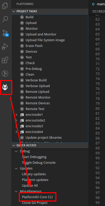 Надо войти в терминал, который называется PlatformIO CLI. Причем надо войти в такой терминал, который принадлежит текущему проекту. Для этого надо выбрать какой-нибудь исходный файл того проекта (по другой информации - надо переключиться на нужный проект), для которого нужно получить PlatformIO CLI. Далее надо нажать на крупную иконку PlatformIO в левой части IDE. Далее надо развернуть Quick Access - Miscellaneous, и выбрать пункт PlatformIO Core CLI.