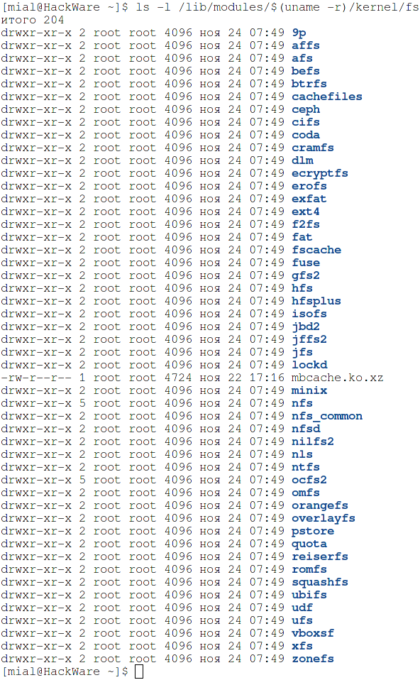 При этом операция монтирования препятствует другим действиям, например, форматированию или созданию нового раздела. Перед тем как перейти к управлению разделами на диске или их форматированию, необходимо отмонтировать (размонтировать) диск, иначе будет получена ошибка, что диск используется. При этом сама операция размонтирования (или перемонтирования) может завершиться неудачей и ошибкой, что диск уже занят. Это происходит потому, что какая-то программа открыла и использует файл на смонтированном диске. Чтобы выяснить, какая программа препятствует операции размонтирования/перемонтирования, можно использовать программу lsof следующим образом: lsof /ТОЧКА/МОНТИРОВАНИЯ/ Например, я пытаюсь перемонтировать диск, смонтированный в директорию /mnt/disk_d/ и получаю ошибку, что диск используется. Чтобы определить, какая команда это делает, я запускаю: lsof /mnt/disk_d/ Как можно увидеть, данной программой является doublecmd, идентификатором процесса, по которому её можно выключить с помощью команды kill, является 14470, также показано, что программу запустил пользователь mial, а также показано, какой именно файл или папка являются открытыми (колонка NAME). Что нужно для монтированияДля того чтобы компьютер смог успешно работать с файловой системой, необходимо, чтобы Linux поддерживал данную файловую систему. К счастью, в ядро Linux уже встроена поддержка большинства файловых систем, с которыми вы можете столкнуться. Самыми распространёнными файловыми системами являются ext2, ext3, ext4, xfs, btrfs, vfat, sysfs, proc, nfs и cifs. Уже на этапе установке Linux из ISO образа вы могли сталкиваться с одной из этих файловых систем. Образ диска ISO сам по себе является файловой системой iso9660. Но это ещё не всё, на образе файлы дистрибутива могут быть упакованы в файлы *.sfs — это файловая система sysfs (так сделано в Manjaro). На установочном образе Linux Mint вы сможете найти файл filesystem.squashfs, это файловая система Squashfs. Содержимое установочного диска Manjaro:
