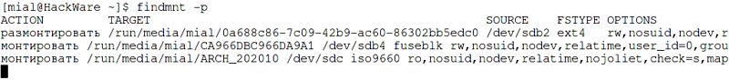 Но среди вывода будут различные виртуальные файловые системы, которые нужны не всегда. Команда mount также может показывать список точек монтирования, но эта функция в ней поддерживается только для обратной совместимости. Тем не менее, для вывода смонтированных реальных файловых систем вы можете использовать команду: mount | grep "^/dev" А для показа всех точек монтирования, запустите команду следующим образом: mount Вы можете наблюдать процесс монтирования и размонтирования в реальном времени. К примеру, для отслеживания любых действий по монтированию и размонтированию в файловой системе используйте команду: findmnt -p Общая команда монтирования диска имеет вид: mount ОПЦИИ УСТРОЙСТВО ДИРЕКТОРИЯ В ней: