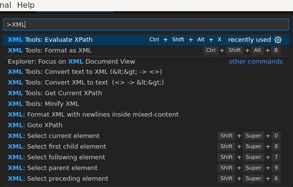 Навигация по XML-файлу Один из этих плагинов добавит в область Explorer раздел XML DOCUMENT. В этом разделе в древовидном виде станет отображаться структура XML-файла (если, конечно, файл корректный). Кликая на дерево, можно быстро перепрыгивать к нужной части XML-документа. Если XML-файл читается XML-парсером, но в нем есть ошибки структуры, то эти ошибки будут доступны во вкладке Problems внизу экрана: Форматирование XML-кода (XML бъютифайер) Чтобы отформатировать XML-документ с правильными отступами и переводом строк, в которых написаны теги, надо выделить весь текст сочетанием Ctrl+A. Затем делается клик правой кнопкой мыши, и в контекстном меню выбирается пункт Format Document. (То же самое можно сделать по сочетанию клавиш Ctrl+Shift+I). Можно считать, что это "встроенный" XML beautifier. Внимание! Если файл большой, то вначале будет казаться, что ничего не происходит. Интерфейс продолжает работать, ничего не зависает, как будто никакой команды на форматирование не давалось. На самом деле, форматирование запускается в фоновом процессе, и когда оно завершится, файл на экране будет изменен. Поэтому стоит просто подождать несколько секунд пока не будет виден результат. Выборка узлов по XPath-запросу Самое главное, что нужно запомнить, чтобы XPath-выборка сработала правильно: Перед запросом выборки, надо курсором встать на тот XML-элемент, внутри которого будет происходить выборка. Если этого не сделать, то поиск будет происходить в том элементе, где находится курсор в текущий момент. Хотя пользователь обычно ожидает, что выборка будет идти по всему XML-документу. Другими словами, чтобы запрос обработал весь XML-документ, надо не забыть встать курсором на корневой элемент. Чтобы сделать выборку через XPath запрос, необходимо вызвать соответствующую команду. Делается это следующим образом. Вначале вызывается Палитра команд. Для этого в меню нажимается: View - Command Palette Или можно просто нажать Ctrl+Shift+P. В открывшейся строке ввода надо набрать строку "XML" и дальше выбрать инструмент с названием: XML Tools: Evaluate XPath Выбор инструмента будет выглядеть примерно так: После выбора инструмента надо нажать Enter. Появится окно, куда необходимо ввести строку запроса XPath: И после нажатия Enter, в окне Output появится содержимое (text content) тех DOM-элементов, которые попали в выборку данного XPath-запроса. Выборка будет показана в виде текстового вывода: XPath Query: //div[@class='prof-item__info']/a[@class='prof-item__spec'] [Line 240] a: Прикладная математика и информатика [Line 318] a: Механика и математическое моделирование [Line 401] a: Статистика [Line 483] a: Математика и компьютерные науки [Line 561] a: Математическое обеспечение и администрирование информационных систем К сожалению, быстро прыгнуть на какой-нибудь найденный узел с помощью мышки не получится. Пока что видно только одно решение этой задачи: нажать Ctrl+G или в меню выбрать: Go - Go To Line/Column И в появившемся поле ввода написать необходимый номер строки и нажать Enter. Редактор VSCode перенесет курсор на заданную строку. |