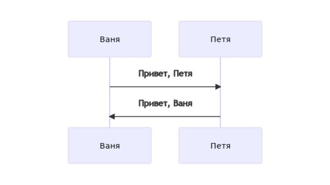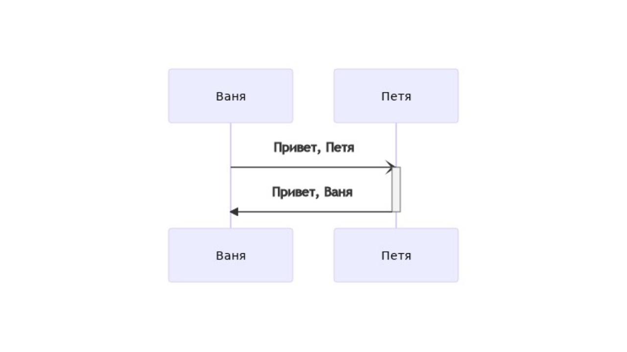 Актеров можно объявлять неявно сразу во время указания отношений, а можно сначала объявить всех участников с помощью ключевого слова participant, а потом отмечать отношения. sequenceDiagram participant Ваня participant Петя Ваня->>Петя: Привет, Петя Петя->>Ваня: Привет, Ваня