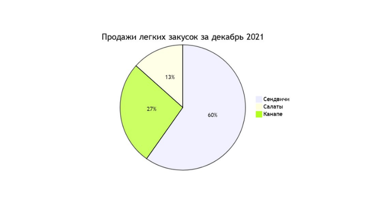 pie title Продажи легких закусок за декабрь 2021 "Сендвичи" : 223 "Салаты" : 50 "Канапе" : 100
