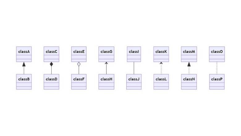 classDiagram classA <|-- classB classC *-- classD classE o-- classF classG <-- classH classI -- classJ classK <.. classL classM <|.. classN classO .. classP