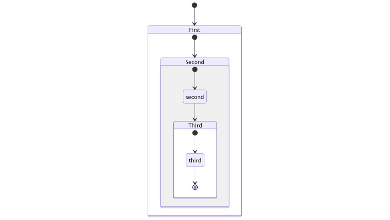 Состояния можно объединять в подсостояния и группировать между собой. Главное состояние обозначается ключевым словом state, за ним следует идентификатор, а потом фигурные скобки, в которых содержится тело подсостояния. stateDiagram-v2 [*] --> First state First { [*] --> second second --> [*] } Поддерживается и вложенность в несколько уровней: stateDiagram-v2 [*] --> First state First { [*] --> Second state Second { [*] --> second second --> Third state Third { [*] --> third third --> [*] } } }