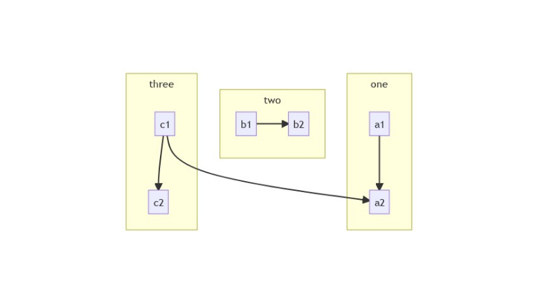 Система рендеринга автоматически подбирает длину стрелок и соединений, но если надо явно задать большую длину, то можно указать большее количество дефисов. Зачастую на одной блок-схеме необходимо показать взаимосвязанную работу двух алгоритмов. Для этих целей подойдут подсхемы, позволяющие визуально разделять несколько сущностей на одном рисунке. Задаются они следующей конструкцией: subgraph название описание графа end Пример: flowchart TB c1-->a2 subgraph one a1-->a2 end subgraph two b1-->b2 end subgraph three c1-->c2 end