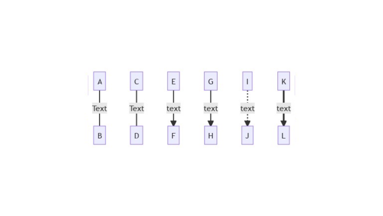 Так же как и в обычной блок-схеме, в Mermaid можно указывать вопрос или размещать текст на стрелках и связях узлов. Для этого достаточно ввести необходимый текст в конструкцию стрелки: flowchart TD A-- Text ---B C---|Text|D E-->|text|F G-- text -->H I-. text .-> J K == text ==> L