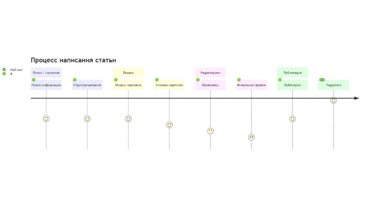 Диаграммы пользовательского путиС помощью диаграммы пользовательского пути можно продемонстрировать процесс того, как каждый тип пользователя пользуется мобильным или веб приложением. Для создания подобных схем в Mermaid есть ключевое слово journey, title также отвечает за название всей диаграммы. С помощью section можно задавать разделы. В каждом разделе указываются конкретные шаги с оценкой по десятибалльной шкале и закрепленным за действием лицом. Все эти данные следует вводить через разделитель в виде двоеточия. journey title Процесс написания статьи section Поиск / изучение Поиск информации: 5: Я Структурирование: 5: Я section Пишем Пишем черновик: 5: Я Готовим картинки: 4: Я section Редактируем Проверяем: 3: Я Финальные правки: 2: Я section Публикация Публикуем: 5: Я Радуемся: 8: Я, Мой кот