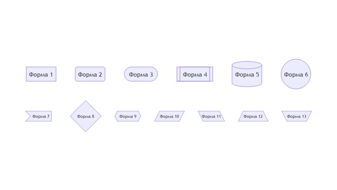 Сами узлы могут быть не только прямоугольными. Форма узла задается символами вокруг текста и доступны следующие геометрические фигуры: flowchart TB node1[Форма 1] node2(Форма 2) node3([Форма 3]) node4[[Форма 4]] node5[(Форма 5)] node6((Форма 6)) node7>Форма 7] node8{Форма 8} node9{{Форма 9}} node10[/Форма 10/] node11[\Форма 11\] node12[/Форма 12\] node13[\Форма 13/]