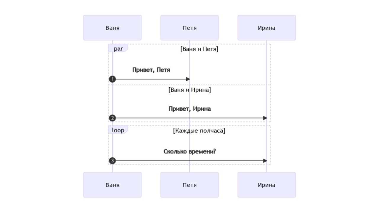 Действия на диаграмме можно автоматически пронумеровать с помощью ключевого слова autonumber в начале кода: sequenceDiagram participant V as Ваня participant P as Петя participant I as Ирина autonumber par Ваня и Петя V->>P: Привет, Петя and Ваня и Ирина V->>I: Привет, Ирина end loop Каждые полчаса V->>I: Сколько времени? end