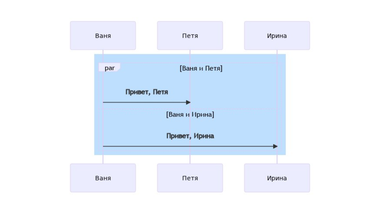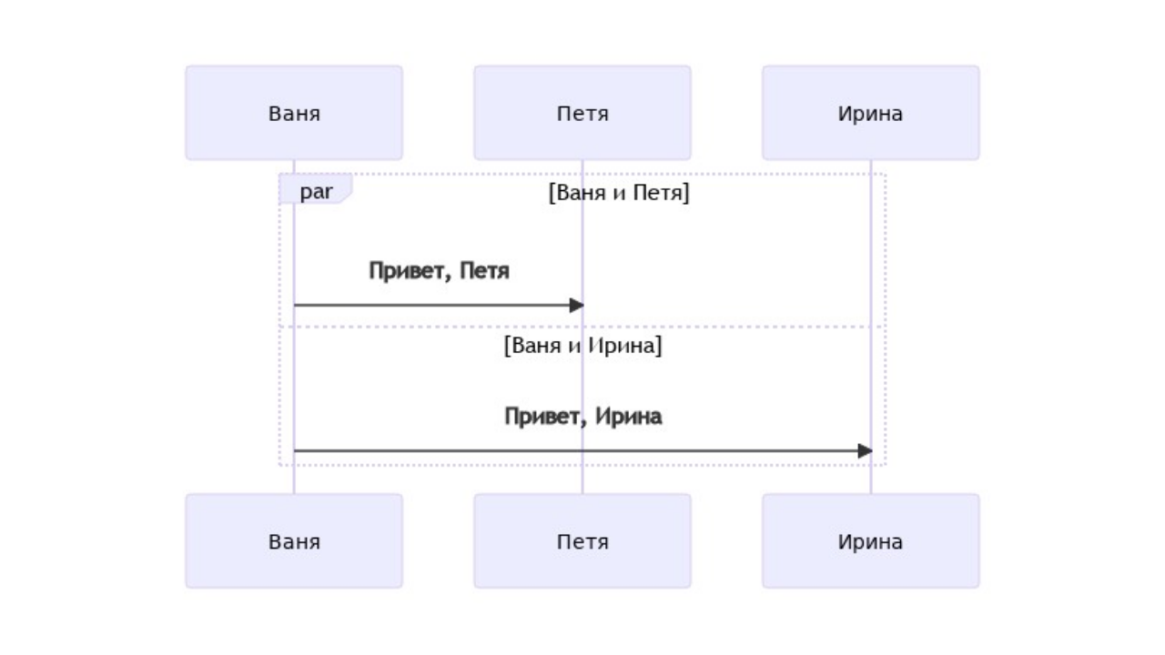 Можно указать параллельные действия. Для этого есть ключевое слово par: par [Действие 1] ... описание ... and [Действие 2] ... описание ... and [Действие N] ... описание ... end К примеру так: sequenceDiagram participant V as Ваня participant P as Петя participant I as Ирина par Ваня и Петя V->>P: Привет, Петя and Ваня и Ирина V->>I: Привет, Ирина end