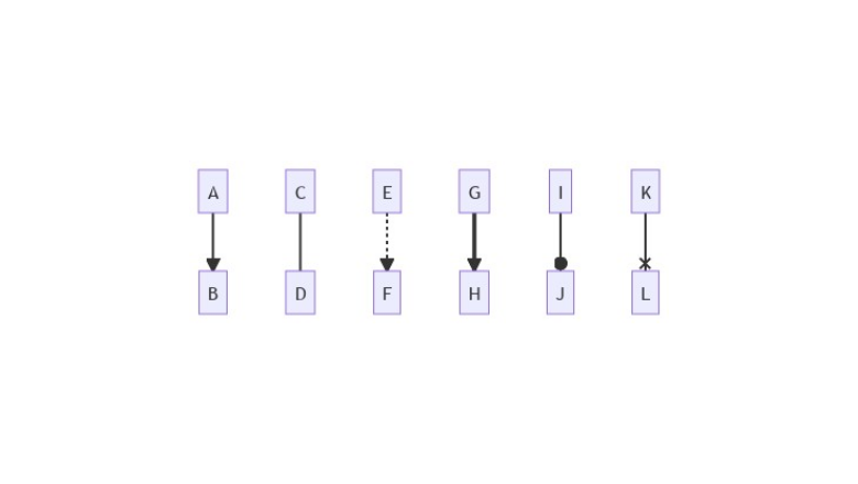 Иногда в самом тексте надо разместить специальные символы, которые в процессе рендеринга могут сломать всю конструкцию. Для этих целей доступно экранирование в виде кавычек. Все содержимое в кавычках по умолчанию принимается за текст. flowchart LR id1["Это текст (а вот это могло сломать рендеринг), но у нас есть экранирование"] Узлы в блок-схеме соединяются с помощью стрелок и линий. В коде они указываются следующим образом: flowchart TB А --> B C --- D E -.-> F G ==> H I --o J K --x L