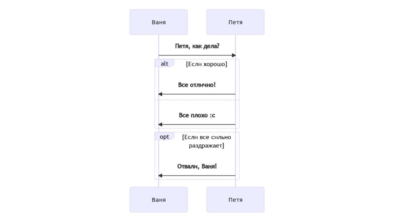 Альтернативные сценарии и условия обозначаются следующей конструкцией: alt Описание ... действие ... else ... действие ... end Необязательные опциональные сценарии задаются без else: opt Описание ... действие ... end Пример: sequenceDiagram participant V as Ваня participant P as Петя V->>P: Петя, как дела? alt Если хорошо P->>V: Все отлично! else P->>V: Все плохо :с end opt Если все сильно раздражает P->>V: Отвали, Ваня! end