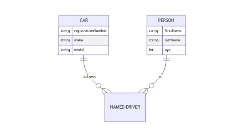 Атрибуты сущностей обозначаются после имени самой сущности. Также существует два вида записи. erDiagram CAR ||--o{ NAMED-DRIVER : allows CAR { string registrationNumber string make string model } PERSON ||--o{ NAMED-DRIVER : is PERSON { string firstName string lastName int age }
