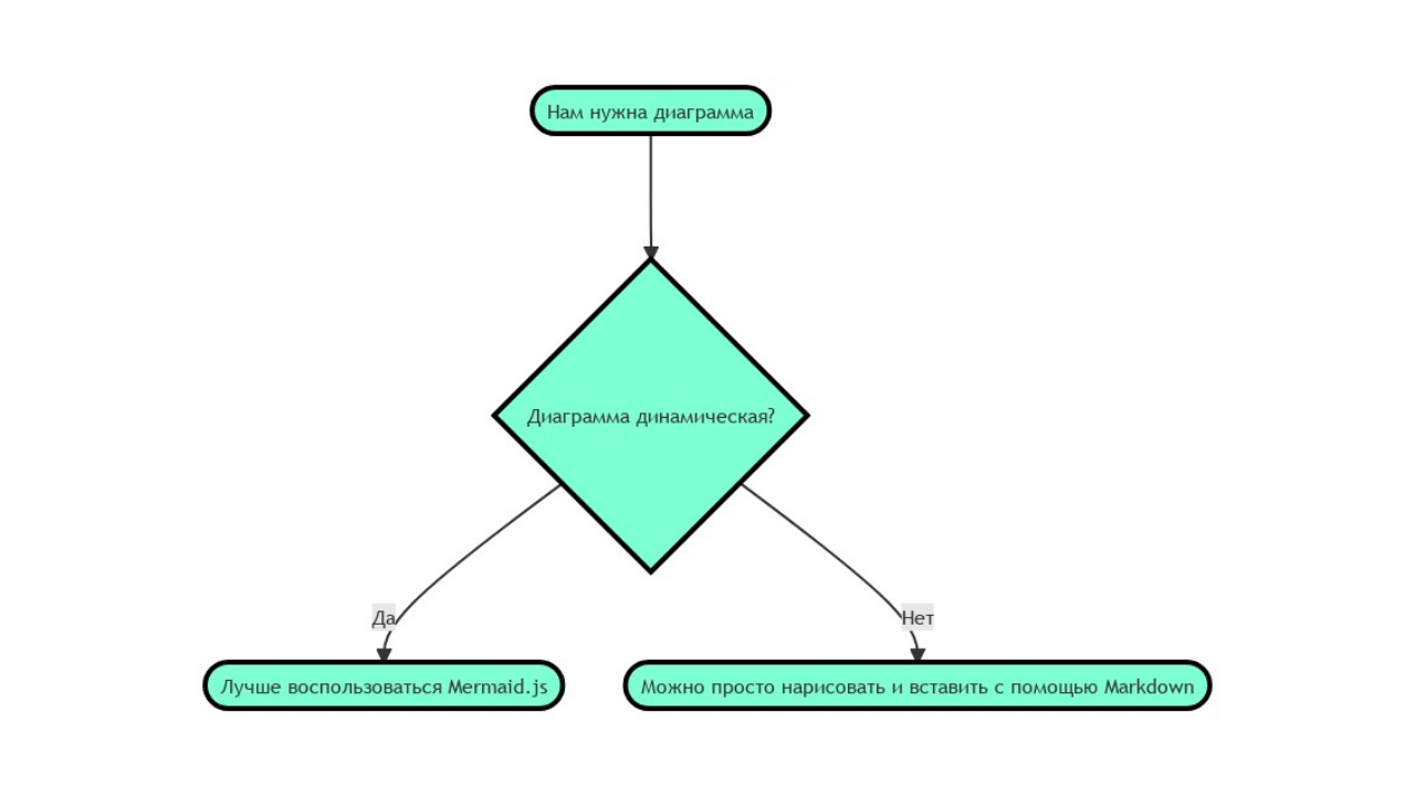 Если применить все полученные знания, то можно построить вот такую несложную блок-схему. flowchart TD classDef class1 fill:#7FFFD4, stroke:#000, stroke-width:4px A([Нам нужна диаграмма]):::class1 B{Диаграмма динамическая?}:::class1 A--->B B--Да-->C([Лучше воспользоваться Mermaid.js]):::class1 B--Нет-->D([Можно просто нарисовать и вставить с помощью Markdown]):::class1