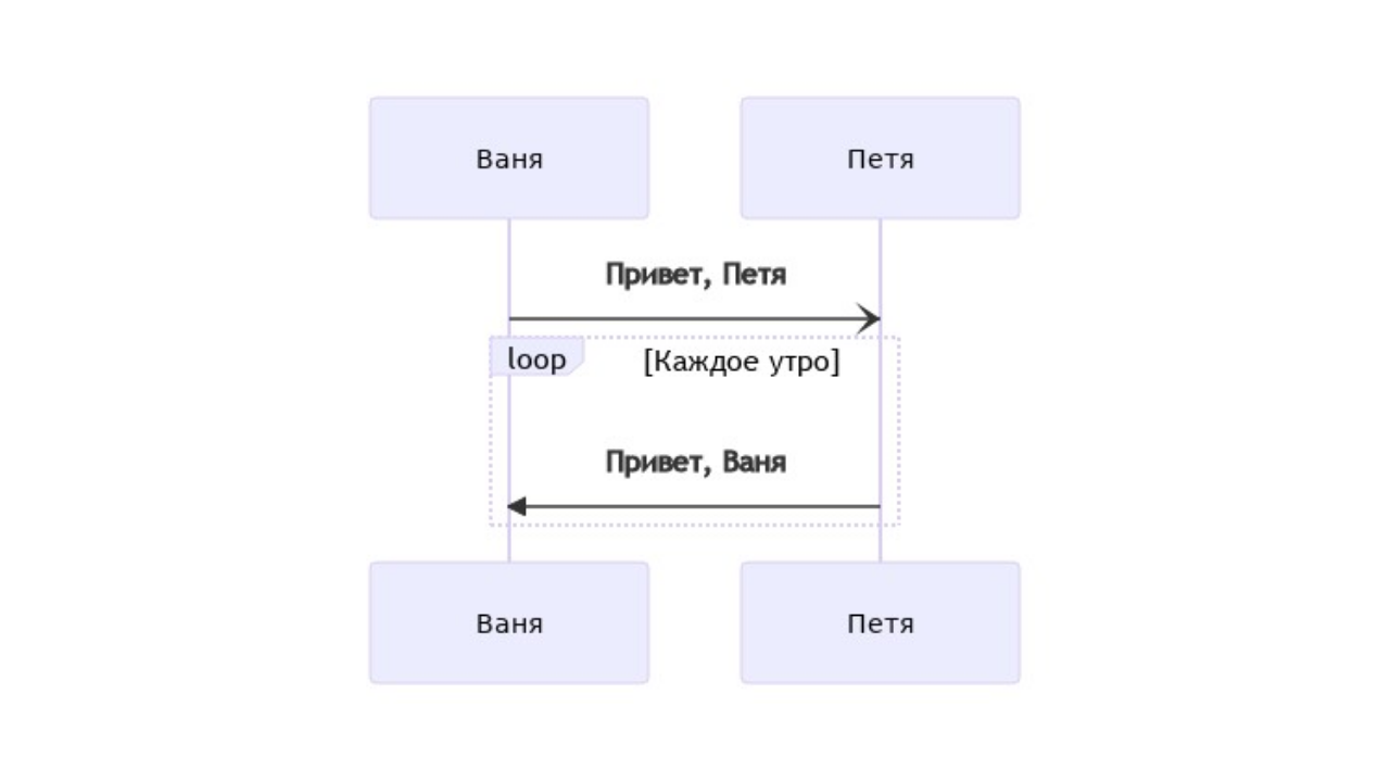 Часто одно и то же действие происходит в цикле и активируется с определенным интервалом. В Mermaid циклы задаются с помощью ключевого слова loop: loop Текст цикла ... действие ... end К примеру: sequenceDiagram participant V as Ваня participant P as Петя V-)P: Привет, Петя loop Каждое утро P->>V: Привет, Ваня end