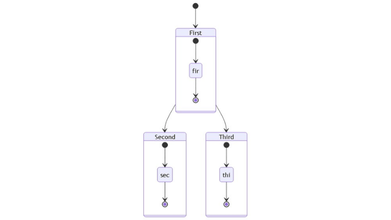 Можно оформлять переходы между несколькими подсостояниями: stateDiagram-v2 [*] --> First First --> Second First --> Third state First { [*] --> fir fir --> [*] } state Second { [*] --> sec sec --> [*] } state Third { [*] --> thi thi --> [*] }