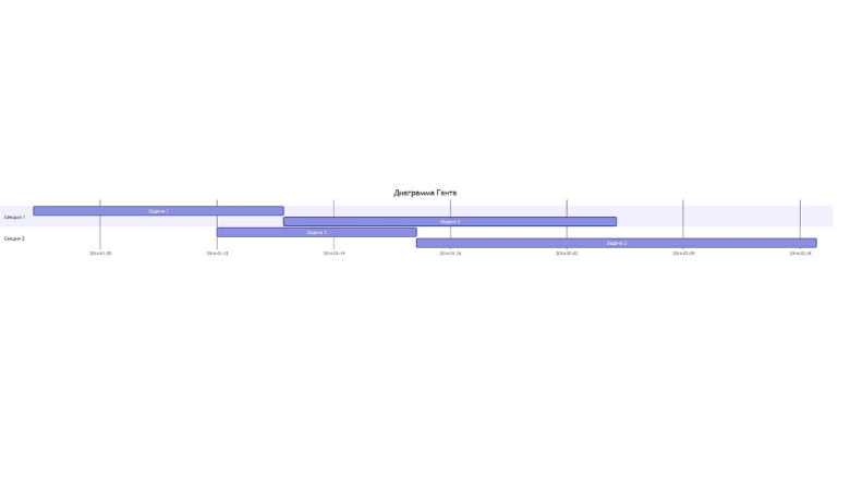 Диаграмма ГантаДиаграмма Ганта часто применяется в приложениях для планирования и отображает процесс работы над проектом. Обычно такая диаграмма состоит из двух основных частей — временной шкалы и задач. Подобные виды отслеживания задач довольно популярны и первую версию придумали аж в 1910 году, поэтому за более чем сотню лет появились альтернативные и расширенные виды. Но у всех вариантов всегда одна и таже задача. В Mermaid диаграммы Ганта состоят из двух частей — на оси X находится шкала времени, а на оси Y задачи и порядок их выполнения. Такой вид диаграммы задается ключевым словом gantt, в title вписывается название. Далее следует указать формат даты, который система будет принимать для рендеринга итоговой диаграммы (dateFormat). Разделы по оси Y задаются с помощью ключевого слова section и названия раздела. А далее следует указывать сами задачи, которые состоят из короткого текста задачи, имени, даты начала и продолжительности. При этом текст задачи располагается с левой части, а остальные параметры с правой и разделяются запятой. Через ключевое слово after можно явно указать последовательность задач в рамках раздела, если этого не сделать, то система сама расположит их по порядку. gantt title Диаграмма Ганта dateFormat YYYY-MM-DD section Секция 1 Задача 1 :a1, 2014-01-01, 15d Задача 2 :20d section Секция 2 Задача 1 :2014-01-12 , 12d Задача 2 : 24d
