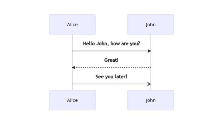 Диаграммы последовательности На диаграммах последовательности отображается жизненный цикл одного объекта или нескольких, а также их взаимодействие. Диаграммы последовательности состоят из актеров в виде прямоугольников и взаимодействий в виде вертикальных «линий жизни». В Mermaid диаграммы последовательности задаются с помощью ключевого слова sequenceDiagram: sequenceDiagram Alice->>John: Hello John, how are you? John-->>Alice: Great! Alice-)John: See you later!