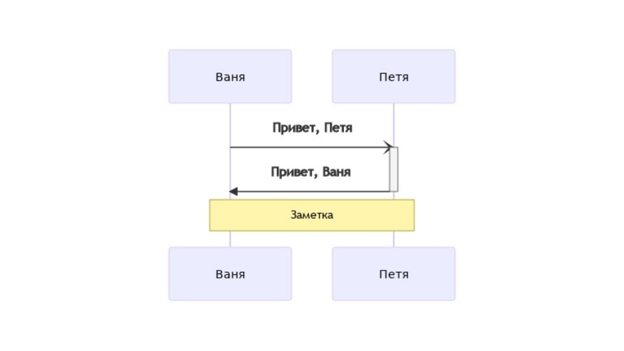 Доступна и сокращенная запись в виде знаков «+/-» на конце стрелок, результат рендеринга будет идентичен: sequenceDiagram participant V as Ваня participant P as Петя V-)+P: Привет, Петя P->>-V: Привет, Ваня Диаграммы последовательности можно снабжать заметками с помощью общего вида записи: Note [ right of | left of | over ] [Актер]: Текст заметки Если ключевые слова right of и left of уже встречались нам, то слово over новое. Оно позволяет размещать заметку сразу на нескольких актерах. sequenceDiagram participant V as Ваня participant P as Петя V-)+P: Привет, Петя P->>-V: Привет, Ваня Note over V,P: Заметка