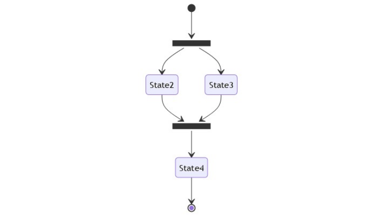 Несколько состояния могут сливаться в одно общее. Для этого состояния, которые сливаются, отмечают ключевым словом fork, а состояние в которое происходит слияние, отмечают словом join. stateDiagram-v2 state fork_state <<fork>> [*] --> fork_state fork_state --> State2 fork_state --> State3 state join_state <<join>> State2 --> join_state State3 --> join_state join_state --> State4 State4 --> [*]