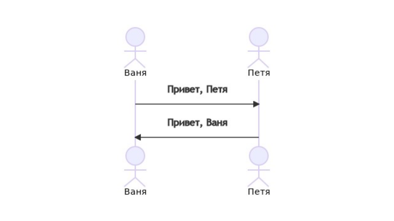 Каждый раз писать имя актера может быть не удобно и долго, особенно если схема состоит из десятка разных актеров. Для этих целей в Mermaid есть псевдонимы. Имя актера можно сократить до нескольких букв или буквенных идентификаторов. sequenceDiagram participant V as Ваня participant P as Петя V->>P: Привет, Петя P->>V: Привет, Ваня Связи и сообщения могут отображаться в виде сплошных или пунктирных линий. Общий вид выглядит следующим образом: [Актер][Стрелка][Актер]:Текст сообщения
