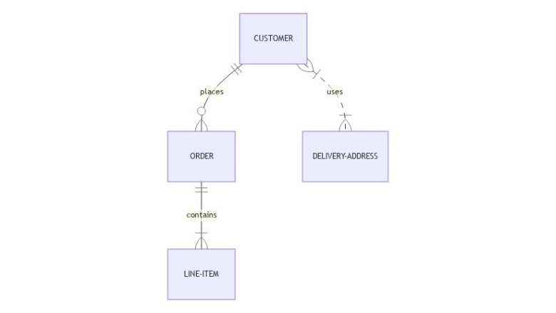 Mermaid не требует указывать имена сущностей с заглавной буквы, а связи обозначаются популярной нотацией «гусиные лапки». Отношения задаются с помощью следующей базовой конструкцией: <first-entity> [<relationship> <second-entity> : <relationship-label>]