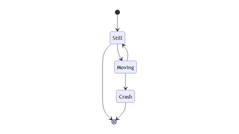 В представленной диаграмме описано три состояния — «Still» (Покой), «Moving» (Движение) и «Crash» (Столкновение). Из состояния покоя можно перейти в состояние движения и обратно, но нельзя перейти в состояние столкновения. А вот из состояния движения можно перейти в состояние столкновения. Состояния задаются следующим образом: stateDiagram-v2 s1 Для описания состояния есть два пути: stateDiagram-v2 state "This is a state description" as s2 s2 : This is a state description Переход от одного состояния к другому задается стрелками: stateDiagram-v2 s1 --> s2 Текст перехода задается так: stateDiagram-v2 s1 --> s2: A transition Начало и конец диаграммы обозначается с помощью символа звездочки, а далее следует стрелка направления перехода: stateDiagram-v2 [*] --> s1 s1 --> [*]