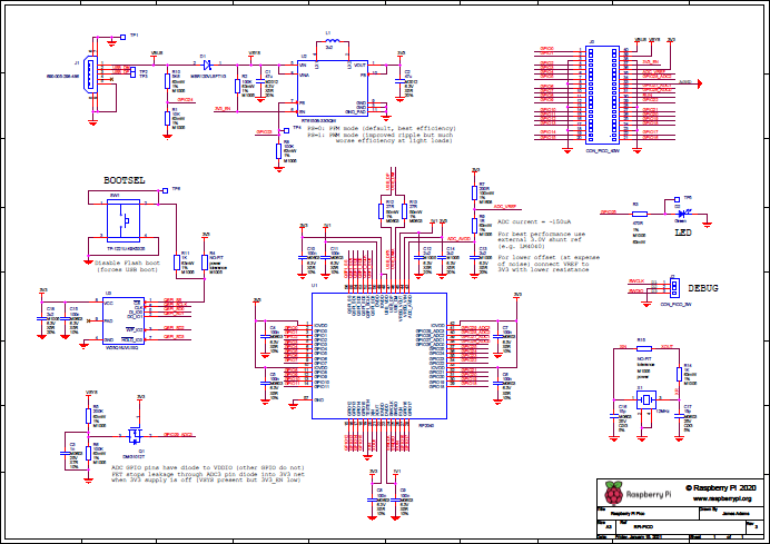 Raspberry Pi Pico поддерживает два метода загрузки: штатный режим и режим загрузчика. Платформа загружается с внешней Flash-памяти, распаянной на плате Raspberry Pi Pico. В диспетчере устройств OS Windows плата отображается как виртуальный COM-порт с именем Устройство с последовательным интерфейсом USB. Активация режима происходит простым подключением плате по USB. Платформа загружается с внутренней памяти микроконтроллера RP2040. В диспетчере устройств OS Windows плата отображается как съёмный накопитель с именем RPI-RP2. Режим служит для загрузки прошивки в формате UF2 простым перемещением файла с одного носителя на другой. Активация режима происходит с помощью кнопки BOOTSEL: